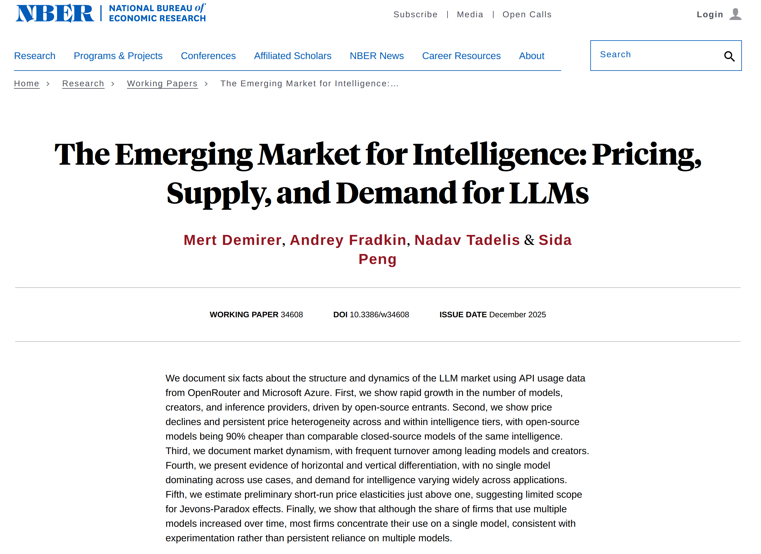 The paper, titled “The Emerging Market for Intelligence: Pricing, Supply, and Demand for LLMs,” uses usage data from OpenRouter to estimate demand price elasticity and draws on Microsoft internal data for a case study of market competition dynamics.